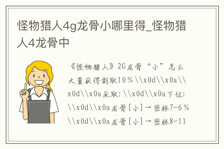 《怪物獵人》2G龍骨“小”怎么大量獲得剝取10%\x0d\x0a\x0d\x0a采取:\x0d\x0a下位:\x0d\x0a龍骨[小]→密林7-6%\x0d\x0a龍骨[小]→密林8-11%\x0d\x0a上位:\x0d\x0a龍骨[小]→密林7-6。1、怪物獵人4g堅牢的鳥龍骨怎么得?上位的怪還是g位的。打上位g位的鳥龍種就有,不要打boss級的。打速龍