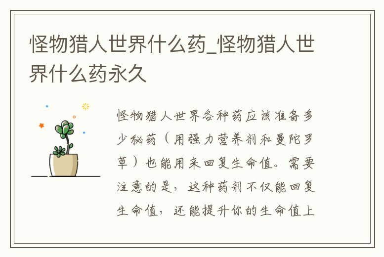 怪物獵人世界什么藥_怪物獵人世界什么藥永久
