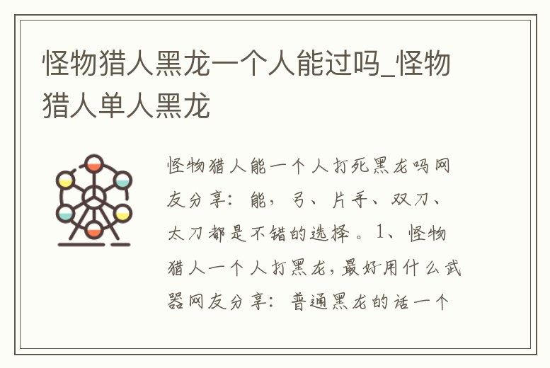 怪物獵人黑龍一個人能過嗎_怪物獵人單人黑龍