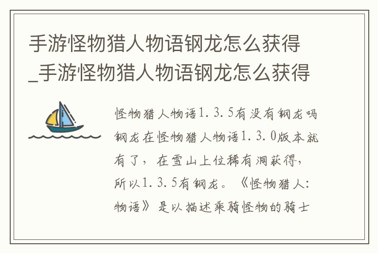 鋼龍?jiān)诠治铽C人物語(yǔ)1.3.0版本就有了,在雪山上位稀有洞獲得,所以1.3.5有鋼龍。《怪物獵人:物語(yǔ)》是以描述乘騎怪物的騎士與怪物們的羈絆,并且一同去冒險(xiǎn)為主題。是《怪物獵人》系列史上首部RPG類型游戲。本作采用動(dòng)漫式。