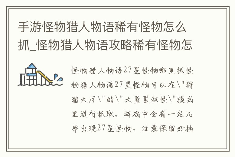 怪物獵人物語27星怪物可以在"狩獵大廳"的"大量累積怪"模式里進行抓取。游戲中會有一定幾率出現27星怪物,注意保留好檔案,以免錯過抓取機會。