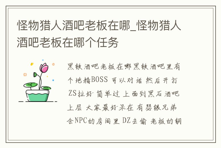 怪物獵人酒吧老板在哪_怪物獵人酒吧老板在哪個任務