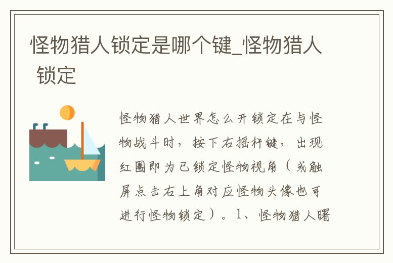 先按ZL,右上角怪物圖標會有鎖定標識,再輕按L的話會直接切換到正對怪物視角,鎖怪只能鎖BOSS級怪物,小怪鎖不了,不能長時間鎖定對新手來說也很麻煩。《怪物獵人》是由CAPCOM研發的一系列動作類游戲,于2004年0。