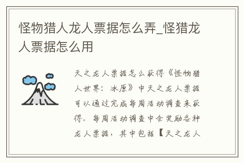 《怪物獵人世界:冰原》中天之龍人票據(jù)可以通過完成每周活動(dòng)調(diào)查來獲得。每周活動(dòng)調(diào)查中會(huì)獎(jiǎng)勵(lì)各種龍人票據(jù),其中包括【天之龍人票據(jù)】,玩家只要每周完成所有活動(dòng)調(diào)查即可獲得?!豆治铽C人世界:冰原》介紹:《冰原》是《怪物獵。