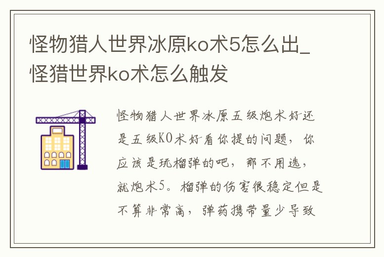 怪物獵人世界冰原五級炮術好還是五級KO術好看你提的問題,你應該是玩榴彈的吧,那不用選,就炮術5。榴彈的傷害很穩定但是不算非常高,彈藥攜帶量少導致很多時候都需要回家拿彈藥,如果出了KO5傷害低很多就不得不回很多次家,打獵效率會大大折扣。榴彈本身眩暈是很高。1、《冰原》ko珠子哪里刷ko珠是怪物獵人世界眾多寶珠的一種,可以