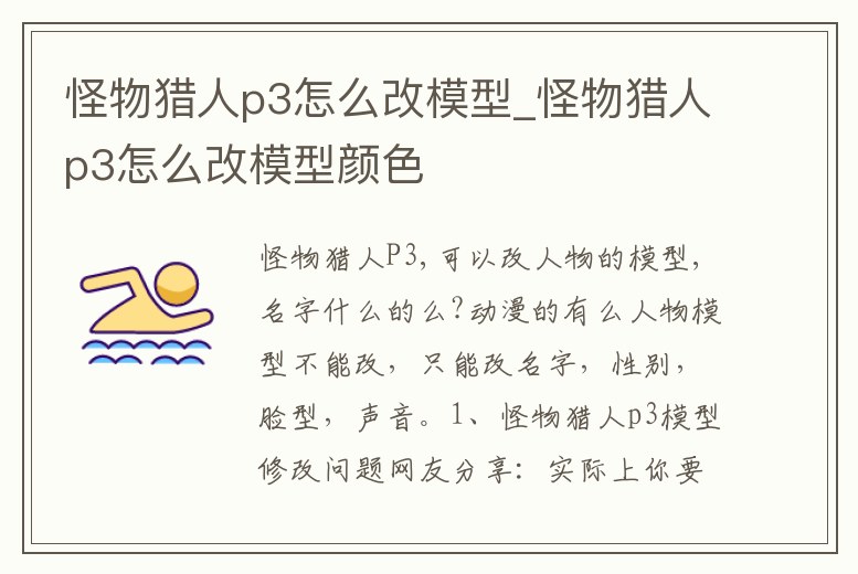 怪物獵人P3,可以改人物的模型,名字什么的么?動漫的有么人物模型不能改,只能改名字,性別,臉型,聲音。1、怪物獵人p3模型修改問題網友分享:實際上你要會用MOD才行。2、switch怪物獵人怎么更換角色模型switch怪物獵人更換角色模型可以用mod修改游戲模型。