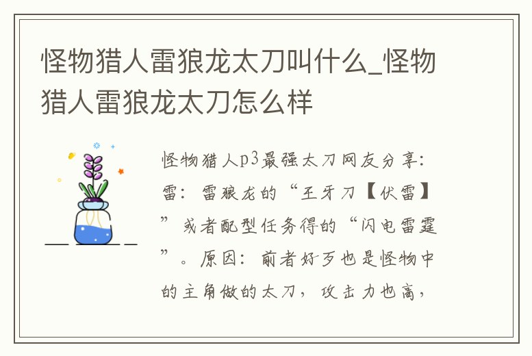 網(wǎng)友分享:雷:雷狼龍的“王牙刀【伏雷】”或者配型任務(wù)得的“閃電雷霆”。原因:前者好歹也是怪物中的主角做的太刀,攻擊力也高,后者雷屬性高,但是攻擊力比較悲觀。水:“南蠻太刀【蛟斬】”或者嵐龍的“兇刀【催花雨】”。原因。