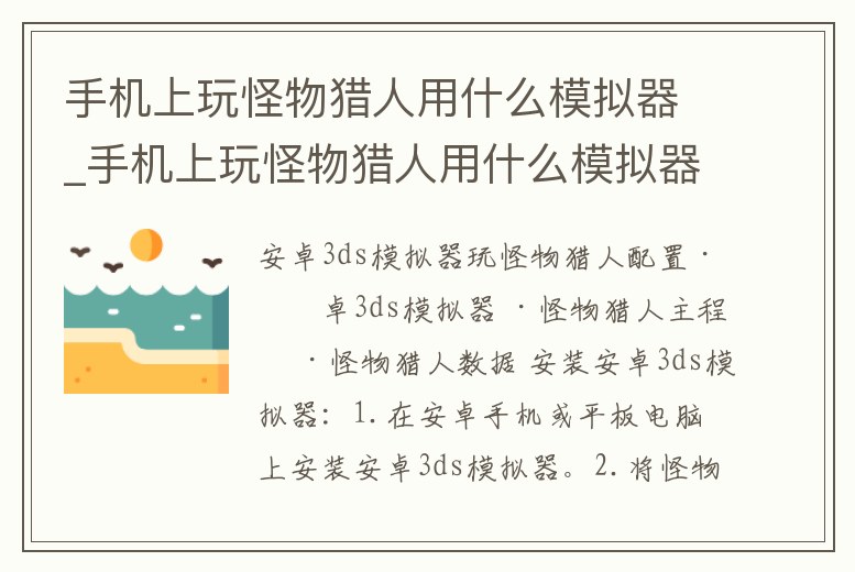 ·安卓3ds模擬器 ·怪物獵人主程序 ·怪物獵人數據 安裝安卓3ds模擬器:1.在安卓手機或平板電腦上安裝安卓3ds模擬器。2.將怪物獵人主程序和數據復制到安卓3ds模擬器安裝目錄下。3.運行安卓3ds模擬器,加載怪物獵人主程序。4.