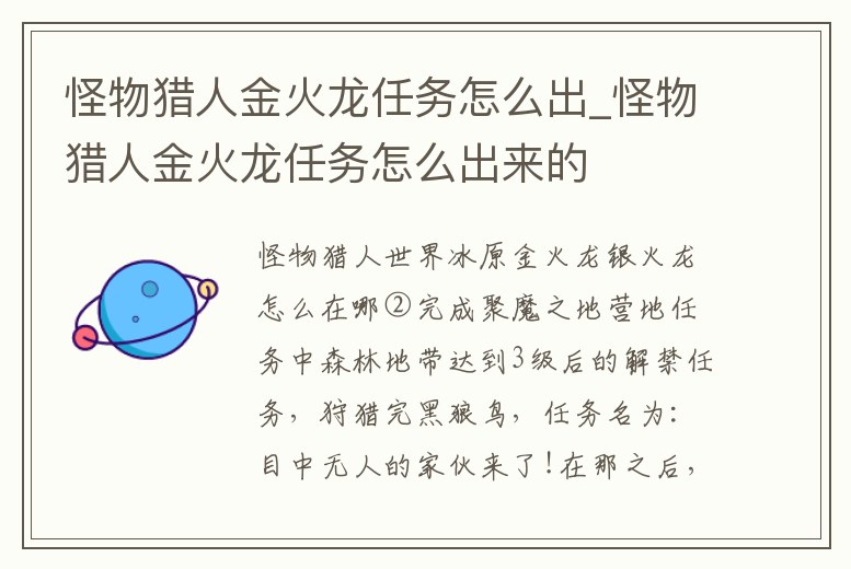 怪物獵人金火龍任務怎么出_怪物獵人金火龍任務怎么出來的