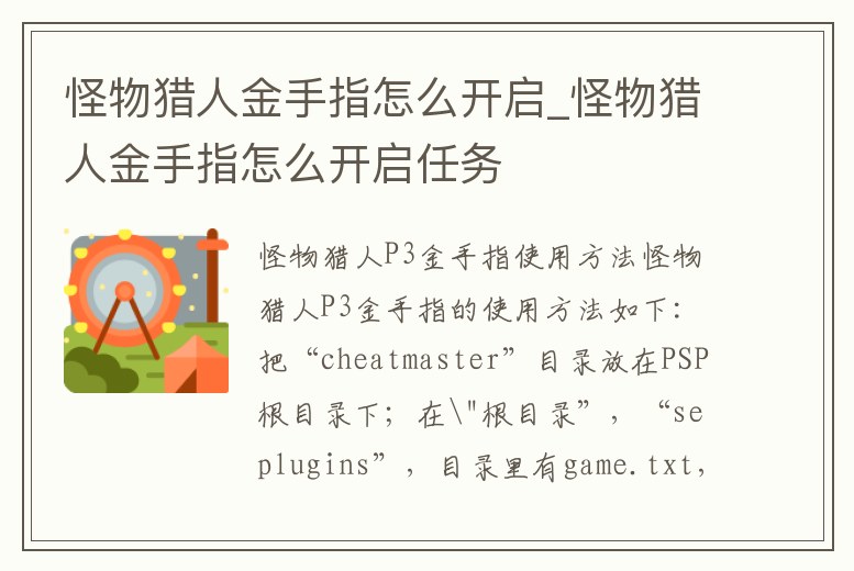 怪物獵人P3金手指的使用方法如下:把“cheatmaster”目錄放在PSP根目錄下;在"根目錄”,“seplugins”,目錄里有game.txt,保存后關機重啟;網上下金手指代碼,復制;在“cheatmaster”目錄下的“cmf”目錄中新建。