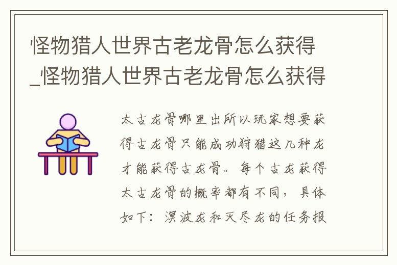 所以玩家想要獲得古龍骨只能成功狩獵這幾種龍才能獲得古龍骨。每個古龍獲得太古龍骨的概率都有不同,具體如下:溟波龍和滅盡龍的任務報酬中會有12%概率出太古龍骨;皇帝龍比較特殊,任務報酬中會有9%的概率出太古龍。