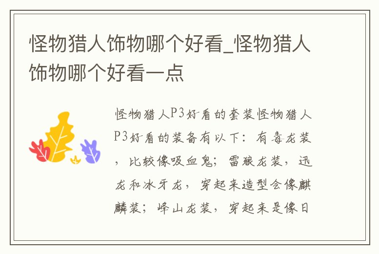 怪物獵人P3好看的裝備有以下:有毒龍裝,比較像吸血鬼;雷狼龍裝,迅龍和冰牙龍,穿起來造型會像麒麟裝;峰山龍裝,穿起來是像日本武士的一個裝備;后期還有一個荒天裝,比較好看一些,可以去主題網(wǎng)上找一找。