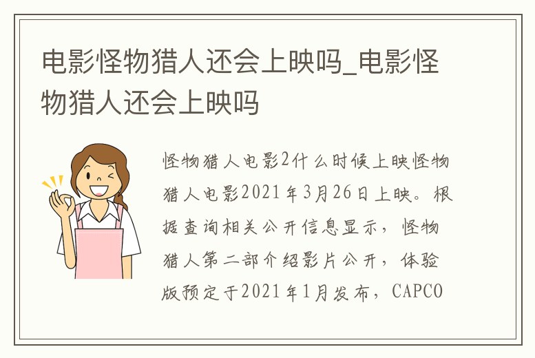怪物獵人電影2021年3月26日上映。根據(jù)查詢相關(guān)公開信息顯示,怪物獵人第二部介紹影片公開,體驗版預定于2021年1月發(fā)布,CAPCOM宣布,2021年3月26日發(fā)售的《怪物獵人》系列最新作的第二部影片上映。