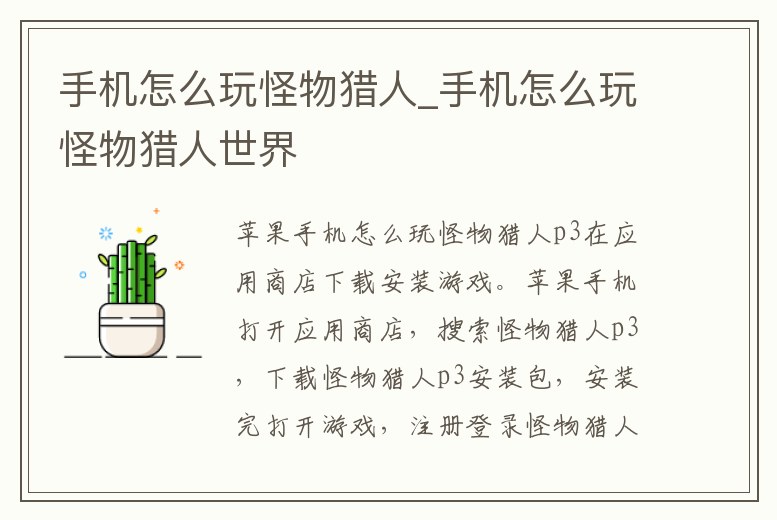 怪物獵人4能用手機玩嗎不可以,因為怪物獵人4是3ds平臺的游戲,國內尚沒有3ds模擬器,所以在手機上玩怪獵4是不現實的,如果有閑錢又喜歡怪獵的話,不妨去買一只機子來玩,求采納 。2、怎么用手機玩怪物獵人可以通過手機模擬器運行怪物獵人。推薦PSP平臺