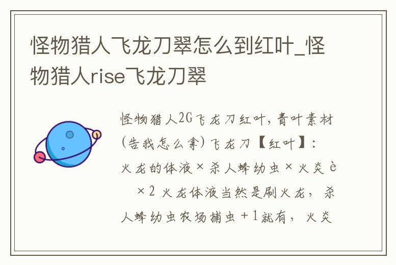 怪物獵人飛龍刀翠怎么到紅葉_怪物獵人rise飛龍刀翠