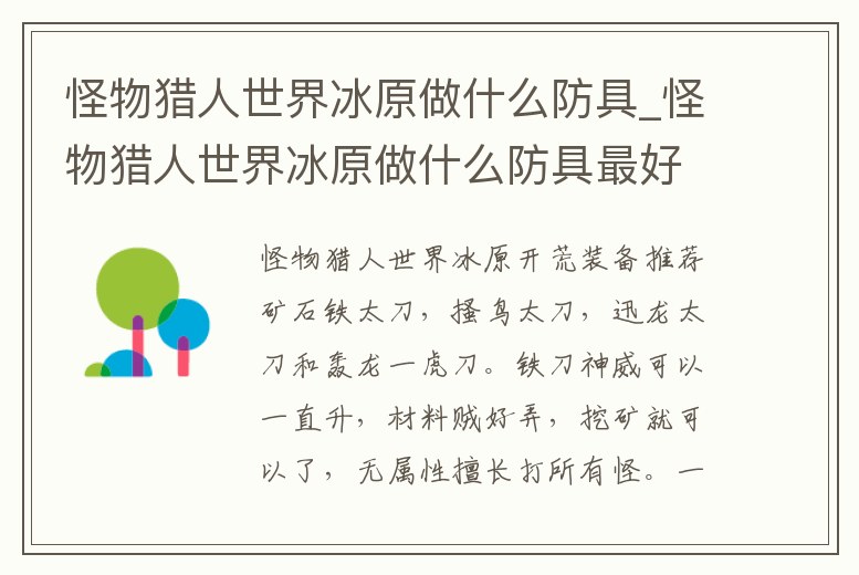 怪物獵人世界冰原做什么防具_怪物獵人世界冰原做什么防具最好
