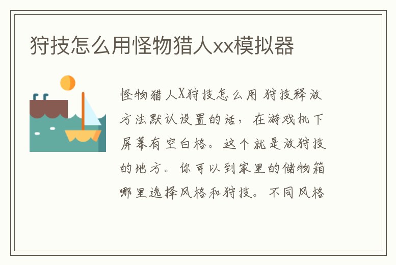 第一步,在自己家中的道具箱那里可以選擇狩獵模式和狩獵技;第二步,把狩獵技的快捷鍵放到3ds的下屏;第三步,在任務中打boss或者雜魚都能或多或少的積蓄技能槽,等到積滿后戳一下你要發動的技能就行了。