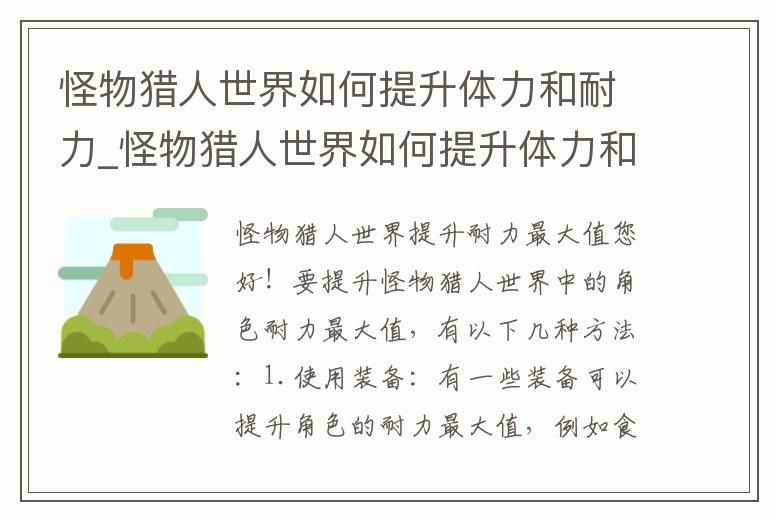 您好!要提升怪物獵人世界中的角色耐力最大值,有以下幾種方法:1. 使用裝備:有一些裝備可以提升角色的耐力最大值,例如食人魚頭盔、藍莓套裝等。2. 吃飯:在游戲中,吃飯可以提升角色的各種屬性,包括耐力最大值。不同的。