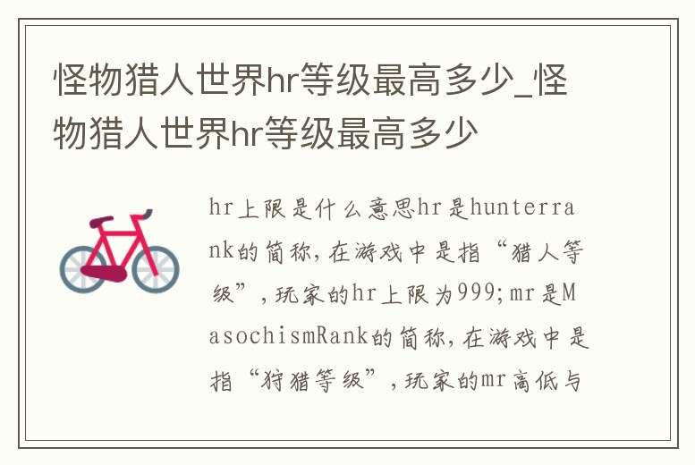 hr是hunter rank的簡稱,在游戲中是指“獵人等級”,玩家的hr上限為999;mr是Masochism Rank的簡稱,在游戲中是指“狩獵等級”,玩家的mr高低與獎勵多少和狩獵難度成正比。HR是進階,意思就是遭遇同樣的怪物血更厚,攻擊力更高。