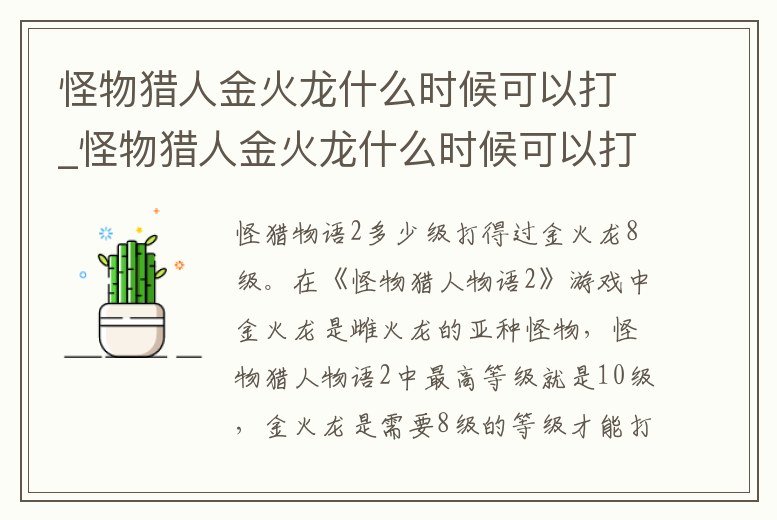 8級。在《怪物獵人物語2》游戲中金火龍是雌火龍的亞種怪物,怪物獵人物語2中最高等級就是10級,金火龍是需要8級的等級才能打得過。