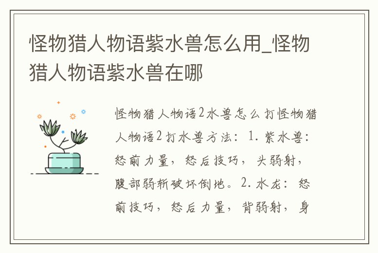- 怪物獵人物語紫水獸怎么用_怪物獵人物語紫水獸在哪