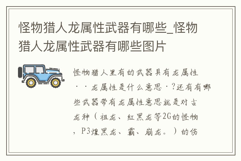 武器帶有龍屬性意思就是對古龍種(祖龍、紅黑龍等2G的怪物,P3煌黑龍、霸、崩龍。)的傷害有另外的增加。即付加龍屬性傷害。前提是被打那個怪物是古龍種。(煌黑龍、崩霸龍等都是。)怪物哪些攻擊帶有龍屬性:常見的:p3。