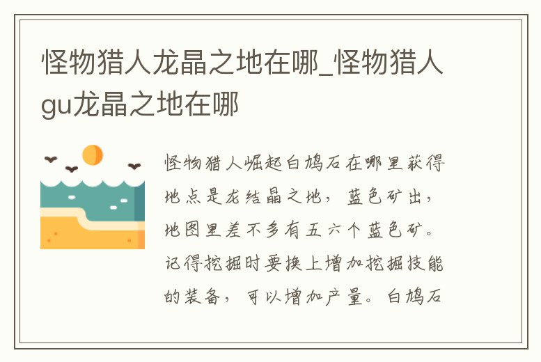 地點是龍結(jié)晶之地,藍色礦出,地圖里差不多有五六個藍色礦。記得挖掘時要換上增加挖掘技能的裝備,可以增加產(chǎn)量。白鳩石全獲得途徑一覽。上位龍結(jié)晶之地6區(qū)采集點。上位龍結(jié)晶之地7區(qū)采集點。上位龍結(jié)晶之地8區(qū)采集點。