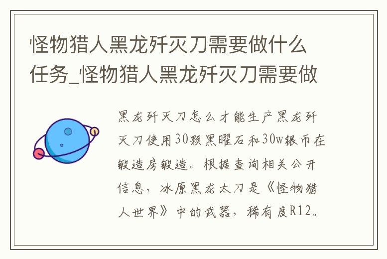 黑龍殲滅刀使用30顆黑曜石和30w銀幣在鍛造房鍛造。根據查詢相關公開信息,冰原黑龍太刀是《怪物獵人世界》中的武器,稀有度R12。攻擊力1155。斬味短紫。會心率負百分之30。龍屬性150。
