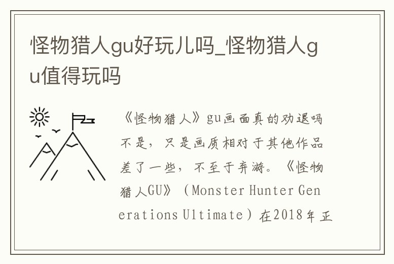 不是,只是畫質(zhì)相對于其他作品差了一些,不至于棄游。《怪物獵人GU》(Monster Hunter Generations Ultimate)在2018年正式發(fā)售,《怪物獵人GU》Switch版能夠隨時隨地享受狩獵樂趣,除了網(wǎng)絡(luò)連線之外還能跟機友面連。這個游戲是同。