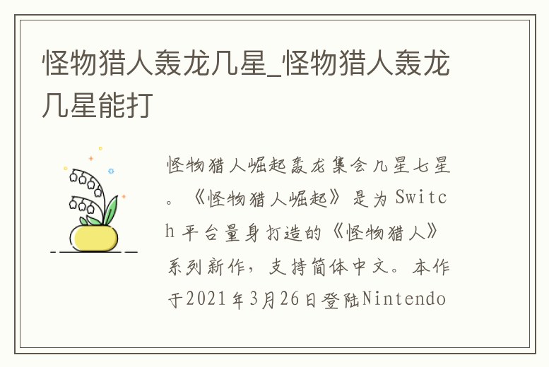 七星。《怪物獵人崛起》是為 Switch 平臺量身打造的《怪物獵人》系列新作,支持簡體中文。本作于2021年3月26日登陸Nintendo Switch,為Nintendo Switch平臺獨占。采用《怪物獵人世界》無縫地圖,Re引擎進行開發,換區時不會有讀。