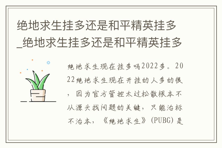 多。2022絕地求生現在開掛的人多的很,因為官方管控太過松散根本不從源頭找問題的關鍵,只能治標不治本,《絕地求生》(PUBG)是由藍洞開發的一款戰術競技型射擊類沙盒游戲。