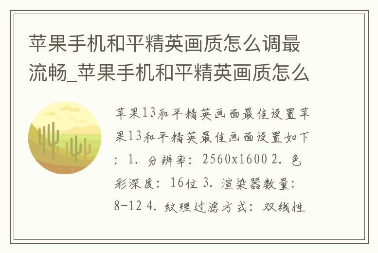 蘋果13和平精英最佳畫面設置如下:1. 分辨率:2560x1600 2. 色彩深度:16位 3. 渲染器數量:8-12 4. 紋理過濾方式:雙線性或三線性。