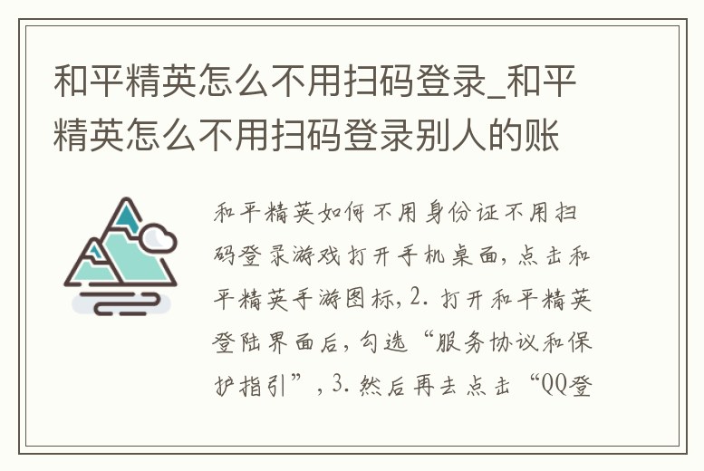 和平精英如何不用身份證不用掃碼登錄游戲打開手機桌面,點擊和平精英手游圖標,2.打開和平精英登陸界面后,勾選“服務協議和保護指引”,3.然后再去點擊“QQ登錄”,4.打開“QQ登錄”界面后點擊“登錄”,查看更多。1、免費和平精英賬號不用驗證碼和平精英免驗證登錄方法如果我們想要登錄和平精英這個游戲