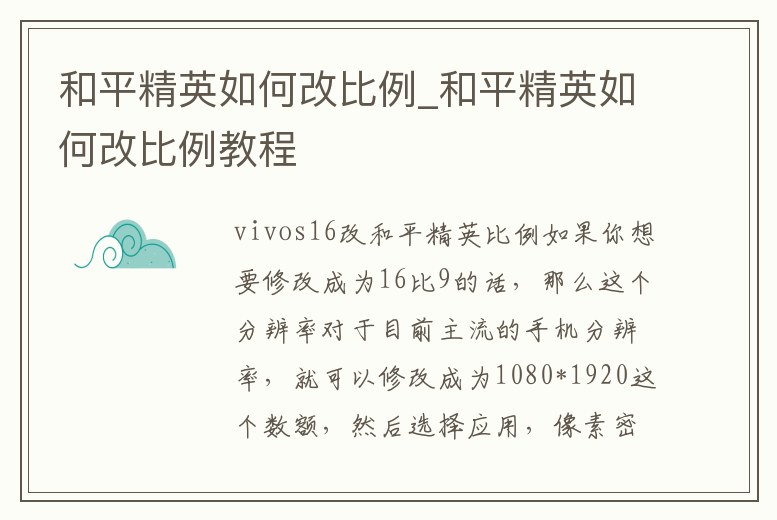 vivos16改和平精英比例如果你想要修改成為16比9的話,那么這個分辨率對于目前主流的手機分辨率,就可以修改成為1080*1920這個數額,然后選擇應用,像素密度可以選擇為440。隨后選擇之后,然后你的屏幕比例就會更改了,由于和你的機型分辨率不一樣,所以。1、榮耀v8pro和平精英改比例操作方式如