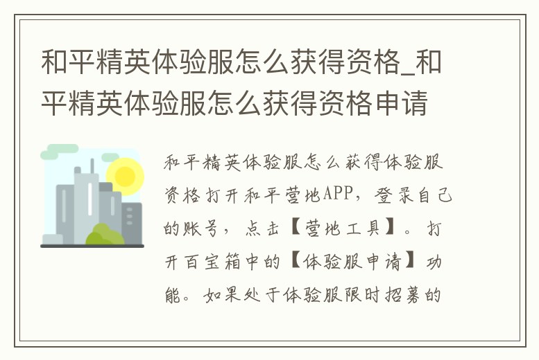 和平精英體驗服怎么獲得體驗服資格打開和平營地APP,登錄自己的賬號,點擊【營地工具】。打開百寶箱中的【體驗服申請】功能。如果處于體驗服限時招募的搶號階段,會看到一個【剩余資格】的界面,點擊【立即搶號】。【PS:每個月只會開啟一次,基本。2、和平精英體驗服資格申請首先下載并安裝【和平營地】APP,這是獲取體驗服資格的官方唯一指定軟件,登錄自己的微信/QQ賬號,在資訊-