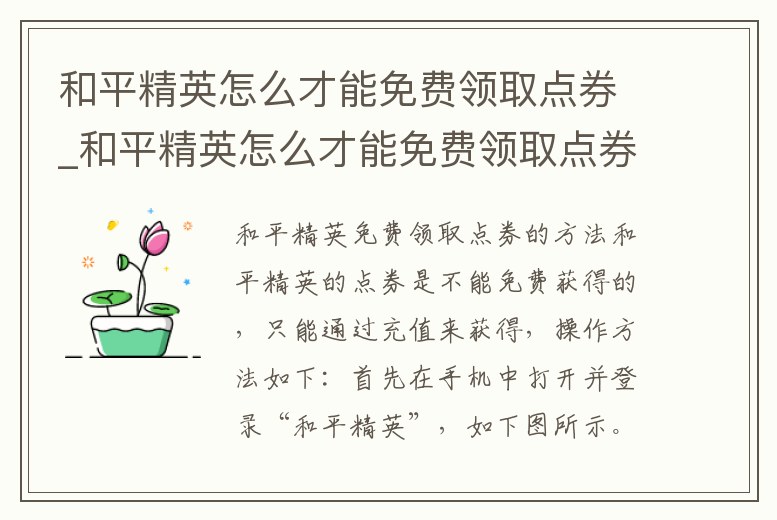 1.兌換碼;2.官方微博;3.活動,免費獲得點券的方法就是參與活動。《和平精英》是由騰訊光子工作室群研發打造的軍事競賽體驗手游,于2019年5月8日正式公測。該游戲為騰訊健康系統“16+”試運行,未滿16周歲用戶將無法登錄。