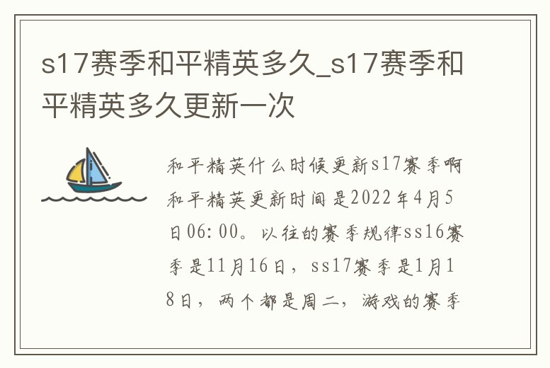 和平精英更新時間是2022年4月5日06:00。以往的賽季規律ss16賽季是11月16日,ss17賽季是1月18日,兩個都是周二,游戲的賽季持續時間一般是兩個月多一點的時間,SS17賽季手冊的結束時間寫著2022年4月。和平精英游戲的賽。