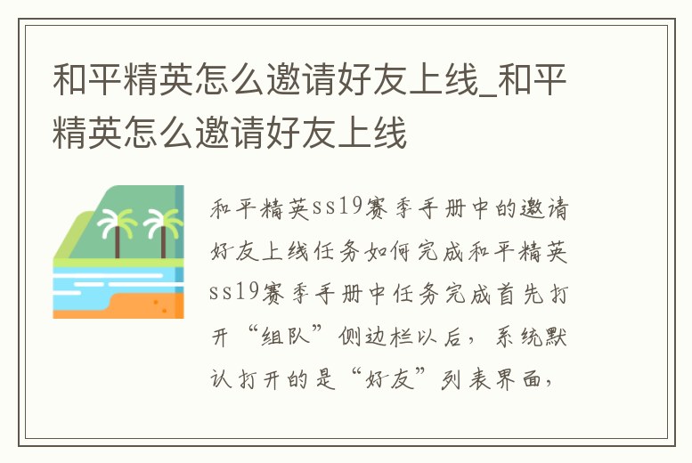 和平精英ss19賽季手冊中任務完成首先打開“組隊”側邊欄以后,系統默認打開的是“好友”列表界面,點擊未上線好友右側的“邀上線”按鈕。其次邀請成功后,在游戲大廳界面上就可以看到“邀請成功”的文字提示。最后打開。