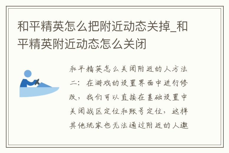 方法二:在游戲的設置界面中進行修改,我們可以直接在基礎設置中關閉戰區定位和賬號定位,這樣其他玩家也無法通過附近的人邀請我們。和平精英關閉附近的人方法說明:方法一:第一種方法就是進入好友列表中,然后選擇其中“附近的。