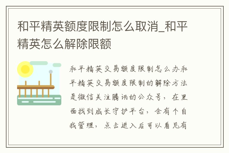 和平精英交易額度限制的解除方法是微信關注騰訊的公眾號,在里面找到成長守護平臺,會有個自我管理,點擊進入后可以看見有個消費管理,然后我們就可以修改消費的額度了。家長們可以用這個來限制孩子,防止過度消費還是蠻好用的。