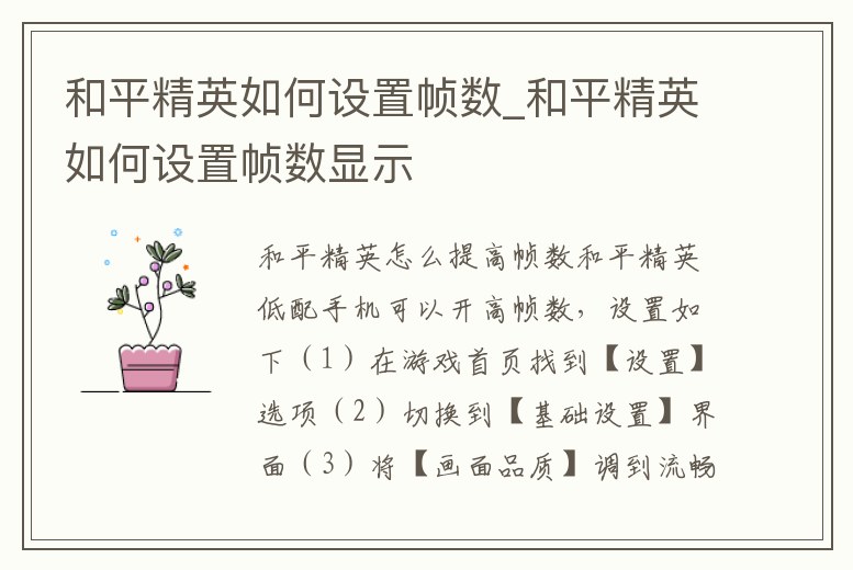 和平精英低配手機可以開高幀數,設置如下 (1)在游戲首頁找到【設置】選項 (2)切換到【基礎設置】界面 (3)將【畫面品質】調到流暢,【幀數設置】設置成高或者超清 (4)關閉【抗鋸齒】與【陰影】物效功能 (5)。