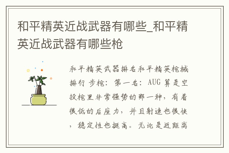 和平精英適合近戰的武器分別有Uzi、湯姆遜、Victor還有ak,在玩和平精英這款游戲當中,很多小伙伴都特別喜歡使用一些殺傷力比較大的武器,比如說m762或者是空投里面的狗雜和Aug,不過很多人在落地的時候都喜歡拿一些沖鋒槍進行防身。