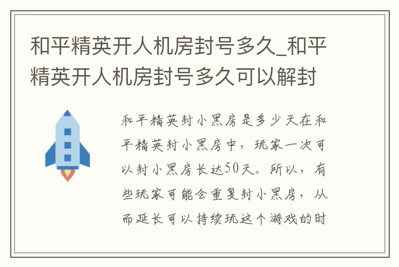 和平精英封小黑房是多少天在和平精英封小黑房中,玩家一次可以封小黑房長達50天。所以,有些玩家可能會重復(fù)封小黑房,從而延長可以持續(xù)玩這個游戲的時間。2、和平精英開掛封多久和平精英開掛的話官方已經(jīng)給出答案,開掛封365