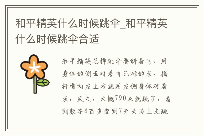 和平精英怎樣跳傘要斜著飛,用身體的側面對著自己標的點,搖桿滑向左上方就用左側身體對著點,反之,大概790米就跳了,看到數字8百多變到7開頭馬上點跳傘,開傘時向前拉滿搖桿。情況二,1700米>跳傘距離>800米:跳傘時對著要跳的點把滑。1、如何