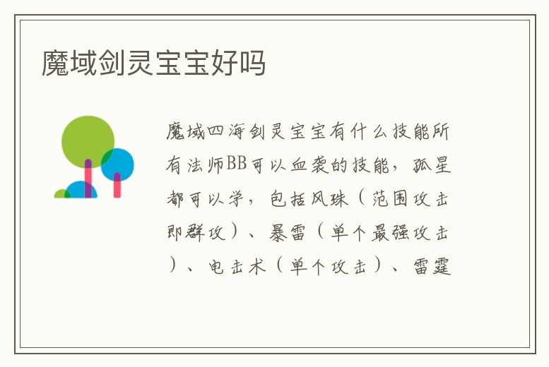 所有法師BB可以血襲的技能,孤星都可以學(xué),包括風(fēng)珠(范圍攻擊即群攻)、暴雷(單個(gè)最強(qiáng)攻擊)、電擊術(shù)(單個(gè)攻擊)、雷霆萬(wàn)鈞(XP技能,樹(shù)心城雜貨商可買)《魔域》是由天晴數(shù)碼娛樂(lè)公司自主研發(fā)的大型魔幻題材網(wǎng)絡(luò)游戲,該。