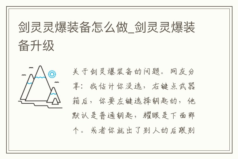 關于劍靈爆裝備的問題。網友分享:我估計你沒選,右鍵點武器箱后,你要左鍵選擇鑰匙的,他默認是普通鑰匙,耀眼是下面那個。或者你就出了別人的后跟別人換。1、劍靈裝備怎么合成?求全面!~網友分享:洪門5段+千魂5段=千魂6段=4銅+一個御龍林毒液(突破)(御龍林毒液可以在綠明村倉庫刷蝎子