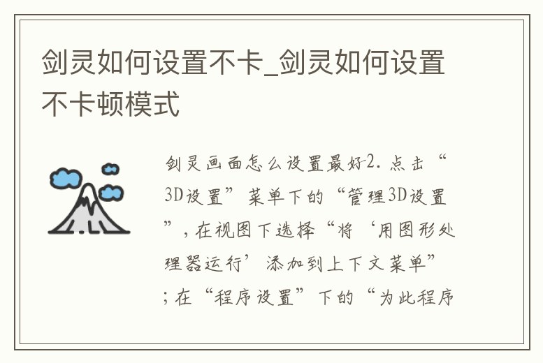 劍靈畫面怎么設置最好2.點擊“3D設置”菜單下的“管理3D設置”,在視圖下選擇“將‘用圖形處理器運行’添加到上下文菜單”;在“程序設置”下的“為此程序選擇首選圖形處理器”下拉菜單中選擇“高性能NVIDIA處理器”,點擊應用。滿意請采納。問
