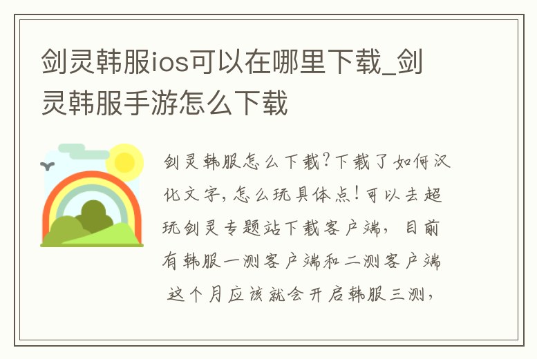 可以去超玩劍靈專題站下載客戶端,目前有韓服一測客戶端和二測客戶端 這個月應該就會開啟韓服三測,馬上就能下三測客戶端了 有專門的漢化的登錄圖文教程,很詳細的。