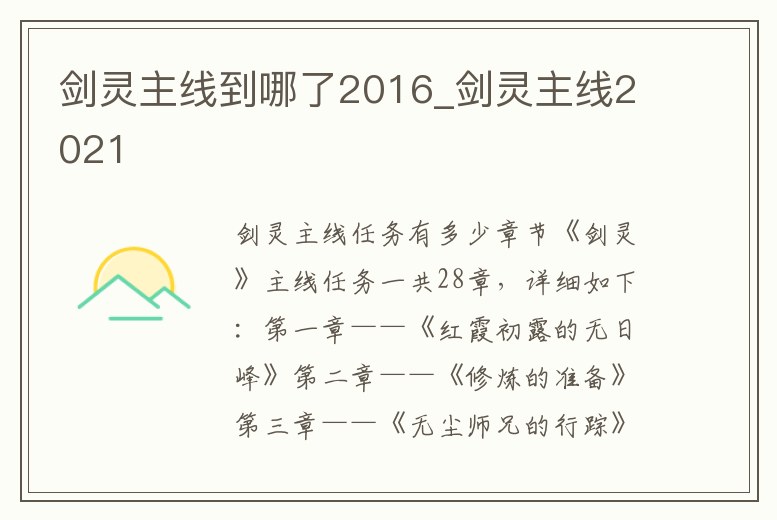 劍靈主線任務有多少章節《劍靈》主線任務一共28章,詳細如下:第一章——《紅霞初露的無日峰》第二章——《修煉的準備》第三章——《無塵師兄的行蹤》第四章——《師傅的傳喚》第五章——《拜入洪門》第六章——《開。1、劍靈主線一共有多少幕阿,在線等劍靈主線一共十幕,分別是:序幕: