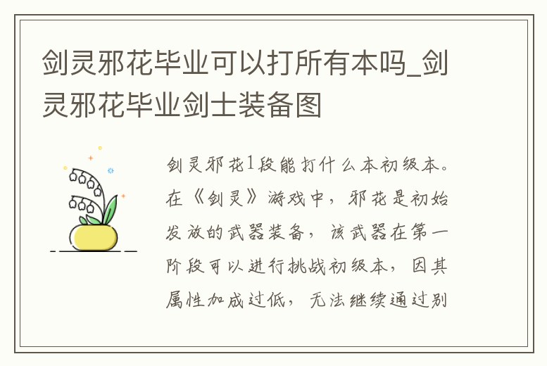 初級本。在《劍靈》游戲中,邪花是初始發放的武器裝備,該武器在第一階段可以進行挑戰初級本,因其屬性加成過低,無法繼續通過別的副本,《劍靈》是一款冒險通關游戲,發布于2016年,憑借其獨特的玩法,一經推出就收獲無數。